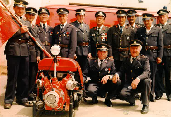 Na fotografiji so suhorski gasilci v paradni obleki, posneti ob motorni brizgalni Magirus. Na njej so, od leve proti desni: Jože Kokolj (drži prapor), Jože Muc, Alojz Kokolj, Anton Šuklje (večkratni tajnik), Jože Jakljič, Ivan Jakljič, Ivan Žlogar (namestnik predsednika), Jože Govednik, Alojz Muc (namestnik poveljnika) in Jože Krašovec. Spodaj, čepe od leve, sta Anton Kolar (predsednik) in Anton Željko (tajnik).