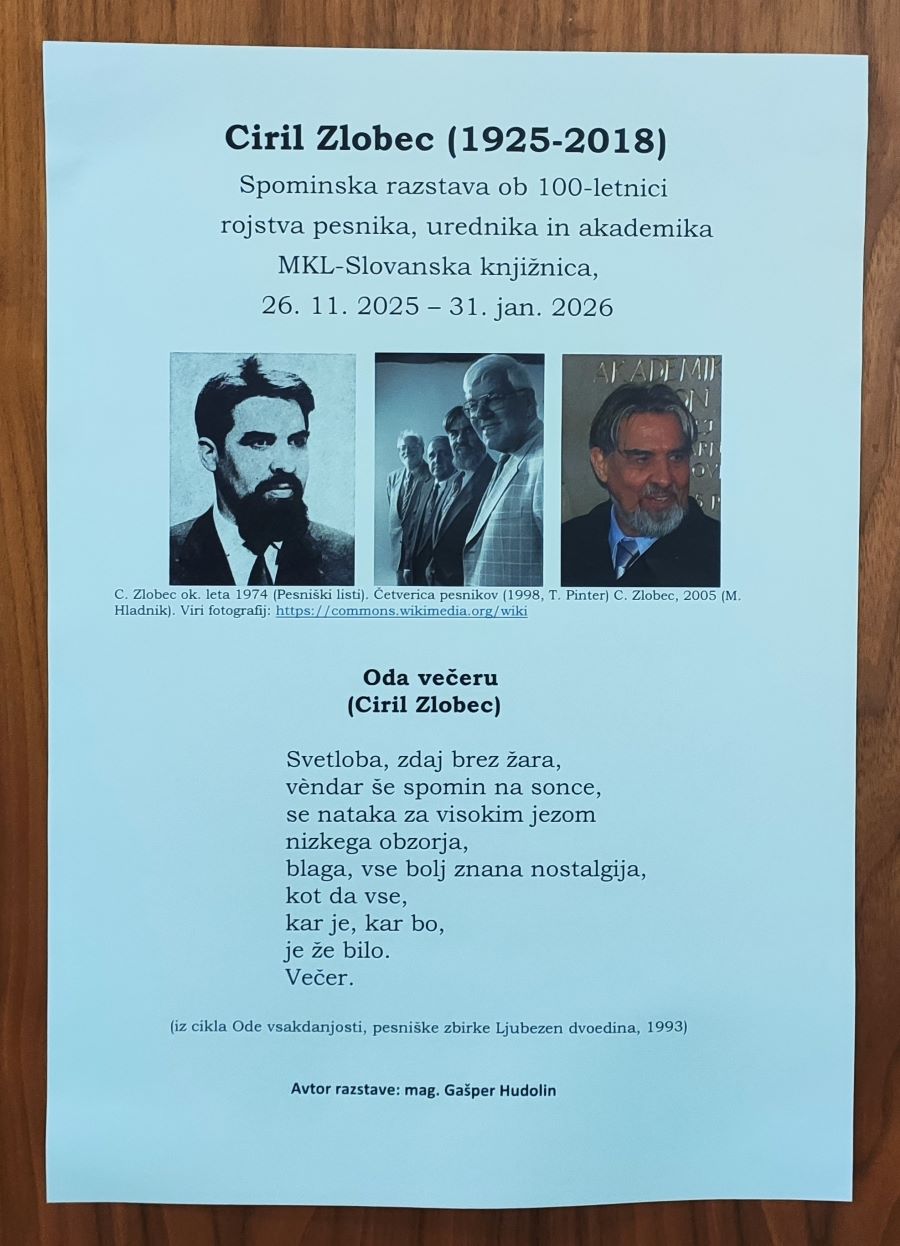 Uvodni razstavni plakat Multimedia element 08.12.2025 15:29 published by Mestna knjižnica Ljubljana Knjižna razstava ob stoletnici akademika Cirila Zlobca v MKL-Slovanski knjižnici je na ogled med 26. 11. 2025 in 31. 1. 2026. Photo FacebookXPinterestLinkedIn Natisni Natisni brez slik