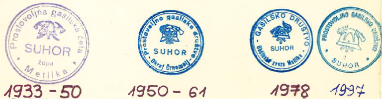 8. avgusta 1948 so se prostovoljne gasilske čete preimenovale v prostovoljna gasilska društva. Na drugem pečatu je tako že zapisan naziv Prostovoljno gasilsko društvo Suhor, Okraj Črnomelj.