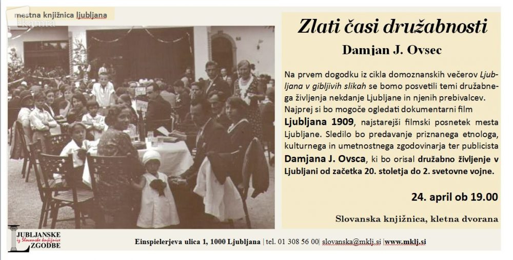Zlati časi družabnosti: prireditveni letak Multimedia element 20.04.2018 10:50 published by Mestna knjižnica Ljubljana Letak za prvi domoznanski večer v sedmi sezoni cikla Ljubljana v gibljivih slikah. Predaval bo gospod Damjan J. Ovsec, slovenski etnolog. Photo FacebookXPinterestLinkedIn Natisni Natisni brez slik