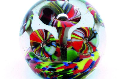 Primer nedokončanega kroglastega obtežilnika s petimi majhnimi deformiranimi cvetovi iz raznobarvnega stekla 15.12.2025 Osrednja knjižnica Celje 0 ogledov