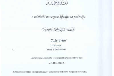Potrdilo o udeležbi in usposabljanju na področju "Vzreja čebeljih matic" 30.12.2016 Mestna knjižnica Ljubljana 187 ogledov