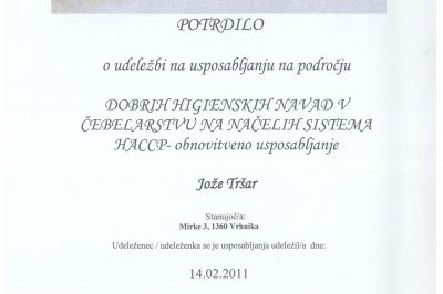 Potrdilo o udeležbi in usposabljanju na področju dobrih higienskih navad v čebelarstvu na načelih sistema HACCP - obnovitveno usposabljanje 30.12.2016 Mestna knjižnica Ljubljana 118 ogledov