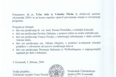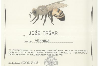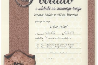 Potrdilo o udeležbi na tečaju in uspešno opravljenem praktičnem preizkusu znanja o tehnologiji čebelarjenja in izkoriščanja čebeljih paš 30.12.2016 Mestna knjižnica Ljubljana 114 ogledov