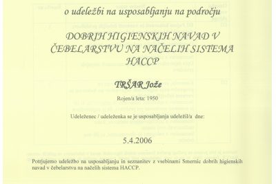 Potrdilo o udeležbi na usposabljanju na področju dobrih higienskih navad v čebelarstvu na načelih sistema HACCP 2006 30.12.2016 Mestna knjižnica Ljubljana 64 ogledov