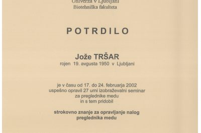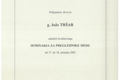Potrdilo o udeležbi na dvodnevnem seminarju za preglednike medu 30.12.2016 Mestna knjižnica Ljubljana 192 ogledov
