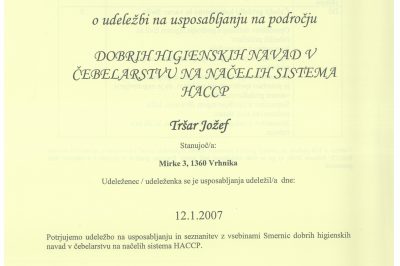 Potrdilo o udeležbi na usposabljanju na področju dobrih higienskih navad v čebelarstvu na načelih sistema HACCP 2007 30.12.2016 Mestna knjižnica Ljubljana 60 ogledov