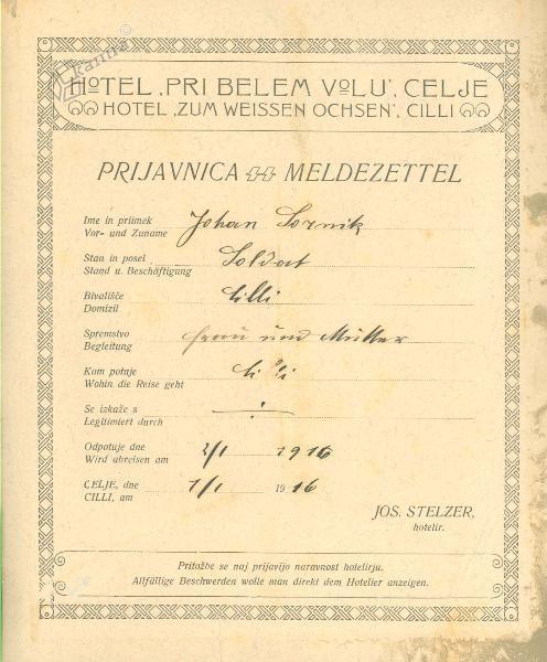 Vojak v hotelu Beli vol Multimedia element 02.11.2011 13:14 published by Zgodovinski arhiv Celje Prijavnica hotela Beli vol v Celju, ki priča o kratkem snidenju vojaka avstroogrske armade leta 1916 s svojci. Photo FacebookXPinterestLinkedIn Natisni Natisni brez slik