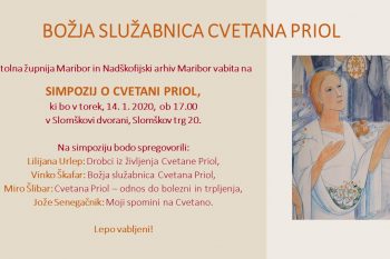 Stolna župnija Maribor in Nadškofijski arhiv Maribor vabita na simpozij o Cvetani Priol, ki bo v torek, 14. januarja 2020, ob 17.00 v Slomškovi dvorani na Slomškovem trgu 20. Na simpoziju bodo spregovorili: