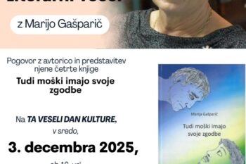 Ta veseli dan kulture bomo letos praznovali z domačo literarno ustvarjalko Marijo Gašparič, članico literarne sekcije Kulturnega društva Fran Ksaver Meško Sveti Tomaž. V pogovoru z Matejo Hržič nam bo predstavila svojo četrto knjigo Tudi moški imajo svoje zgodbe.