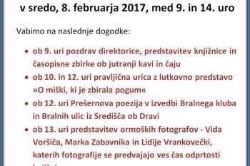 Knjižnica Franca Ksavra Meška vas v sredo, 8. februarja 2017, na slovenski kulturni praznik, vabi v knjižnico, kjer so pripravili dan odprtih vrat. V času od 9. do 14. ure se boste lahko udeležili nekaj zanimivih prireditev!