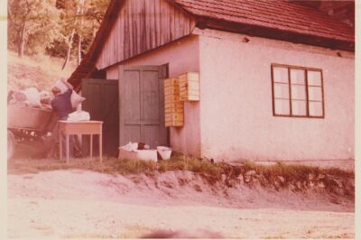 Pred hramom, ki ga danes ni več, stoji voz z velikim lesenim sodom, pripravljenim za prevoz vina. Na vozu stoji sosed Franc Golobič, levo spredaj dedek Franc Hudina drži v rokah čeber, ob vozu pa v vojaški uniformi stoji oče Franc Hudina. Vino so pretočili v sod na vozu, nato pa so ga z voli ali kravami odpeljali kupcu.