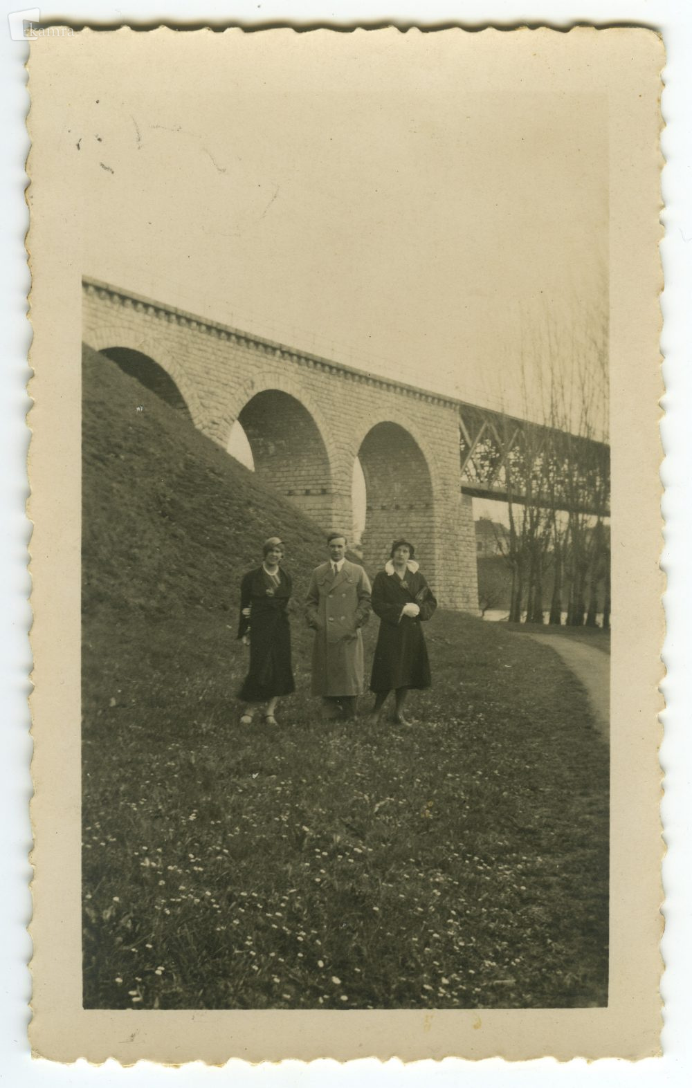 Vsebina: Od leve Jelica Gros (roj. Dular), moški in ženska v plaščih pred novomeškim železniškim mostom