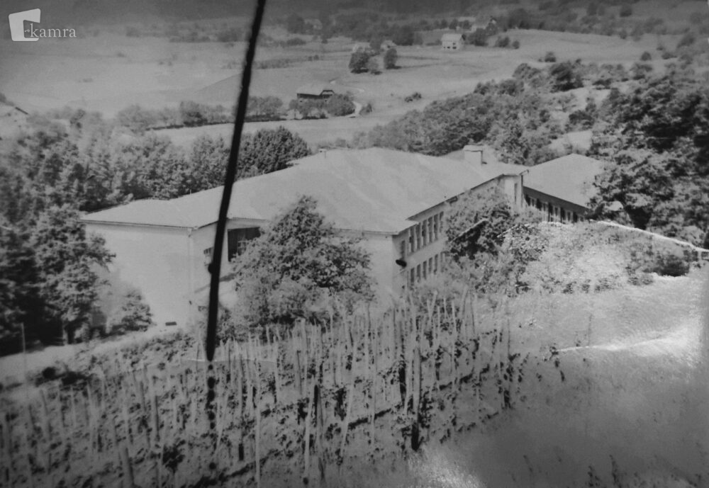 Fotografija metliške osnovne šole, posneta okrog leta 1980, prikazuje šolo v času, ko je nosila ime XV. SNOUB Belokranjsko. Na sliki je jasno vidna tudi stara športna dvorana, pomemben del šolskega vsakdana tistega časa, ki pa je leta 1985 pogorela in tako postala del šolske zgodovine.