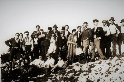 Jelica Gros, roj. Dular (na levi), Davorin Gros starejši s fotoaparatom, in prijatelji, na čolnu ob Krki, Novo mesto, poletje med vojnama