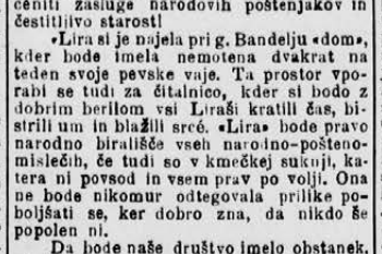 V imenu ‘Lirašev’ odgovarja A. Š. Tropinar: “V Vašem cenjenem listu, v zadnjej številki, odgovarjal je nek dopisnik na Sočin dopis 3. maja, glase se iz Komna, a ker je najglavnejše izpustil, zato se drznem jaz prerešetati vse farizesjke vesti, koji se nahajajo v omenjenem ‘Sočinem’ dopisu, koji dela nečast dopisniku, a še najbolj njegovemu stanu. Jaz se sicer ne maram spuščati v prepir z gosp. dopisnikom cenjene ‘Soče’, a ‘Liraši’ so me pooblastili, naj resnici na ljubo in v obrambo poštenega našega društva ‘Lire’ izjavim to le : a) Skrivaj, ne da bi bil narod znal, skovala je komenska gospoda ‘bralno društvo’. Tudi jaz sem se udeležil prvega razgovora, in sicer vsled vabila, katero mi je došlo točno ob določenej uri od strani necega gospoda. Radostnega srca koračim proti omenjenemu stanovanju, kder je bilo shajališče, kdo bi se pa ne udeležil? Zavednemu Slovencu, ki ve čislati vrednost bralnega društva na deželi, uže beseda sama: ‘bralno društvo’ ali ‘čitalnica’ mu je program. Da se tako društvo snuje, to me je tem bolj veselilo, ker smo uže pevci sami hoteli pred letom ustanoviti društvo podobno našej denašnjej ‘Liri’, ki bi imelo namen: gojiti narodno in cerkveno petje, ter nadaljno izobraževati prosti narod z raznim berilom itd. — Vsi pevci tedaj smo se veselili, da se slednji vendar ustanovi toliko potrebna ‘čitalnica’, in upali smo tudi vsi, da nas novo društvo radostnim srcem in s slovansko gostoljubnostjo vsprejme mej svoje člane, s primerno mesečniuo, toda ni bilo tako, — kajti gospoda je ustanovila društvo za-se, in ta ne mara za slovenskega oratarja. — Pa če tudi nam je up uže splaval po vodi, vendar so me nekateri denašnji ‘Liraši’ (pevajoči in nepevajoči udje) pooblastili, naj pri prvem zborovanji skušam gospodo pregovoriti, da bi tudi mi pristopili novemu društvu, ter da bi nam ne bilo treba oživljati novega uže davnej nameravanega društva, in tako cepiti uže šibke moči. To nalogo sem rad sprejel, in to tem rajše, ker je v društvenih pravilih zapisano, da bode društvo gojilo petje; petja si pa jaz ne morem misliti brez pevcev. Pri prvem zborovanji sem vsled pooblastila interpeloval č. g. predsednika Bratino.,kako misli on, da bi se moglo izvrševati one točke društvenih pravil, ki govore o petju? Ta mi pa prav učeno (?) odgovori: ‘Tako mej seboj bomo kakšno zapeli’. Da si tudi bi človek skoraj na tak jalov odgovor ne mogel in ne smel odgovarjati, vendar še nisem dal miru, ampak prepričati sem ga hotel (in sploh vse), da tako ‘bralno društvo’ na deželi ne izvršuje svojega namena itd., ter dasitudi sem prosil, naj bi se mesečnina z 1 f. na 50 kr. znižala in tako omogočil pristop prostemu ljudstvu, vge prigovarjanje ni nič izdalo, kajti sklenolo se je tako uže prej — pa mirna Bosna! Opazek, koje so se delale mej mojo prošnjo in govorom, ne maram objavljati, kajti če sem takrat potrpel, tem lažje prebijam sedaj, ker je čas uža one dušne rane več ali manj zacelil. Tako ravnanje od strani nekaterih, kojim je zvesto sekundiral tudi g. dopisnik ‘Soče’, vzbudilo je mej prostim ljudstvom splošno nevoljo, in zahtevalo se je odločno od vseh vetrov, da se ima brez odloga ustanoviti novo društvo. Tega ne bi bil niti opisoval, a storiti sem moral, ker omenjeni gospod v ‘Soči’ nekako sumljivo in očitaje piše, kakor češ ‘da se je nekaterim potrebno zdelo vstanoviti novo društvo Lira ‘v Komnu’. — To novo društvo se ni zdelo le nekaterim potrebno, ampak je prepotrebno resnično, da se goji umetno cerkveno in narodno petje, ter da se ljudsvo s čitanjem izobrazuje.