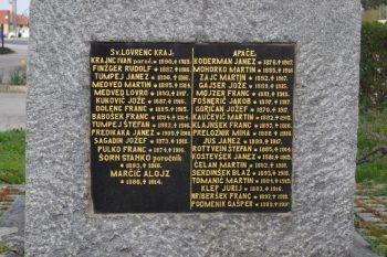 Spomenik je izdelan iz granita, na vrhu stoji štirikotna posoda. Na sprednji strani spomenika je vklesan vojaški križ, pod njim sta pritrjeni črni marmorni tabli, na katerih sta letnici 1914-1918 in besedilo: »Spominu v svetovni vojni padlih vojakov.« Na nasprotni strani spomenika je plošča z letnico postavitve in letnico obnove, ki je bila izvedena leta 1997. Na obeh straneh spomenika sta dve plošči z imeni 51-ih padlih vojakov iz vasi Apače, Pleterje, Sv. Lovrenc in Župečja vas.
