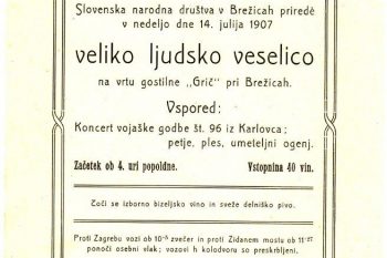 »Začetek ob 4. uri popoldne. Vstopnina 40 vin. Toči se izborno bizeljsko vino in sveže delniško vino. proti Zagrebu vozi ob 10.50 zvečer mešanec in proti Zidanem Mostu ob 11.27 ponoči osebni vlak. Vozovi h kolodvoru so preskrbljeni. Samoborski Sokol vrne lanski obisk. Iz Zagreba se je oglasilo več društev, pride tudi pevsko društvo “Omladina”.  Na mnogobrojno udeležbo vabi uljudno Slavnostni odbor.« (Posavska straža, 14. 7. 1907)