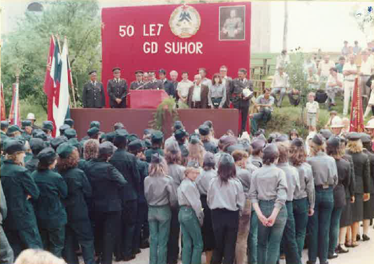 Fotografija je posneta 26. junija 1983 ob 50. obletnici Gasilskega društva Suhor, pred PŠ Suhor. Na tribuni stojijo od leve: Martin Vraničar, Djordje Radovič (predsednik OGZ Metlika), Tone Sentočnik (načelnik Gasilske zveze Slovenije), Anton Kolar (predsednik Gasilskega društva Suhor, nagovarja navzoče), Martin Vrviščar, Alojz Šavoren, Tone Krašovec (predsednik pripravljalnega odbora in predsednik SZDL), Martin Gerkšič, Milan Vajda, Marjanca Radkovič, Franc Stariha in tov. Pirkovič (načelnik GZ).