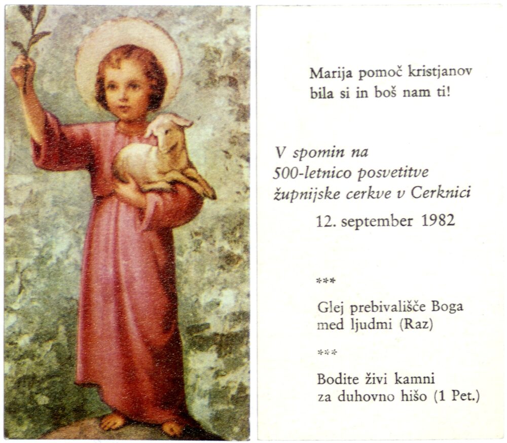 500-letnica posvetitve župnijske cerkve Marijinega rojstva v Cerknici, 1982 Multimédiás elem 16.10.2025 22:06 közzétette Knjižnica Jožeta Udoviča Cerknica 500-letnica posvetitve župnijske cerkve Marijinega rojstva v Cerknici, 12. september 1982. Otrok Jezus, dobri Pastir. Mere: 5,4 x 9,5 cm. Zbirka Joži Mele iz Cerknice. Slika FacebookXPinterestLinkedIn Natisni Natisni brez slik