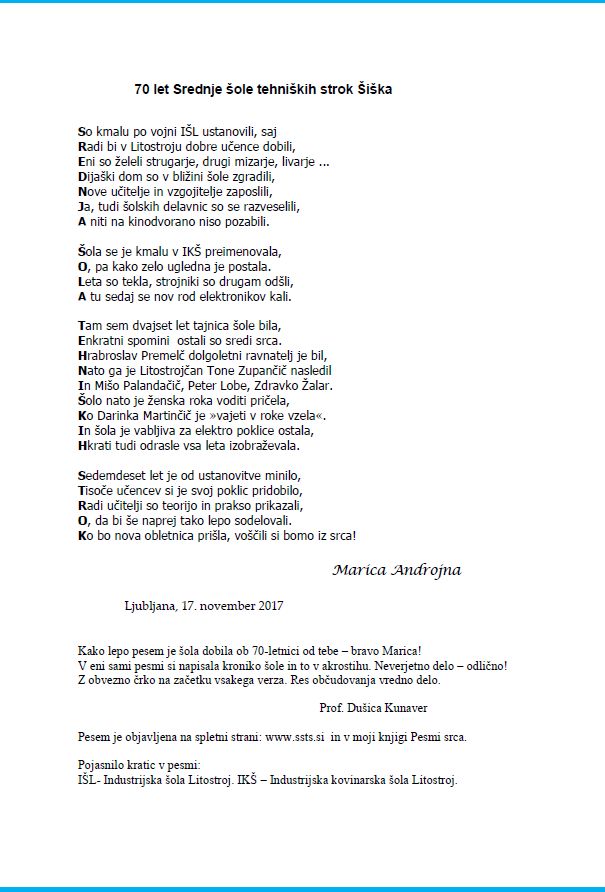 Akrostih ob 70-letnici SŠTS Šiška Multimédiás elem 14.04.2026 16:49 közzétette Mestna knjižnica Ljubljana Akrostih je ob 70-letnici Srednje šole tehniških strok Šiška zapisala ga. Marica Androjna. Dokumentum Download FacebookXPinterestLinkedIn Natisni Natisni brez slik