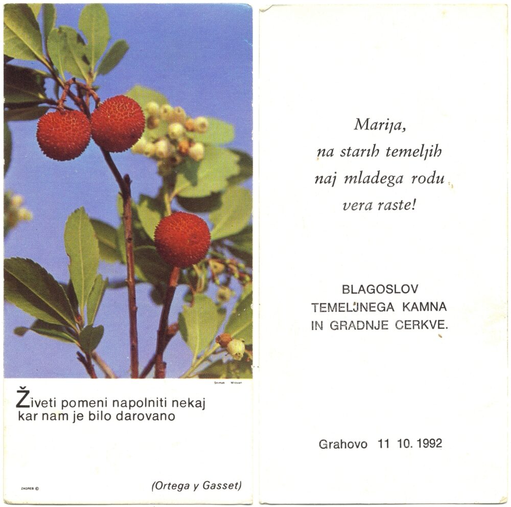Blagoslov temeljnega kamna in gradnje cerkve v Grahovem, 1992 Multimédiás elem 16.10.2025 22:06 közzétette Knjižnica Jožeta Udoviča Cerknica Blagoslov temeljnega kamna in gradnje cerkve v Grahovem, 11. oktober 1992. Veja s plodovi, foto M. Milovan. Tiskano v Zagrebu. Mere: 6,5 x 13 cm. Zbirka Fani Turšič iz Begunj pri Cerknici. Slika FacebookXPinterestLinkedIn Natisni Natisni brez slik