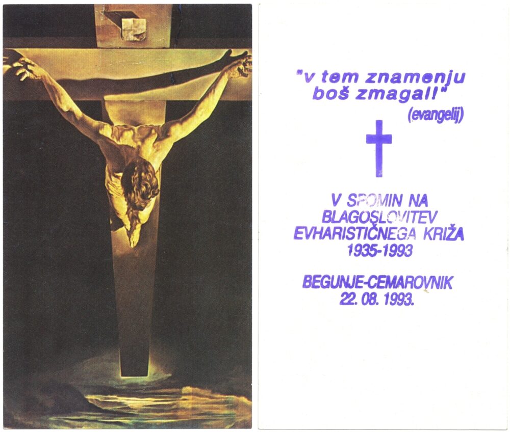 Blagoslovitev evharističnega križa na begunjskem Golem vrhu, 1993 Multimédiás elem 16.10.2025 22:06 közzétette Knjižnica Jožeta Udoviča Cerknica Blagoslovitev evharističnega križa na begunjskem Golem vrhu (Cemarovniku), 22. avgust 1993. Jezus na križu. Mere: 6,5 x 11 cm. Zbirka Fani Turšič iz Begunj pri Cerknici. Slika FacebookXPinterestLinkedIn Natisni Natisni brez slik