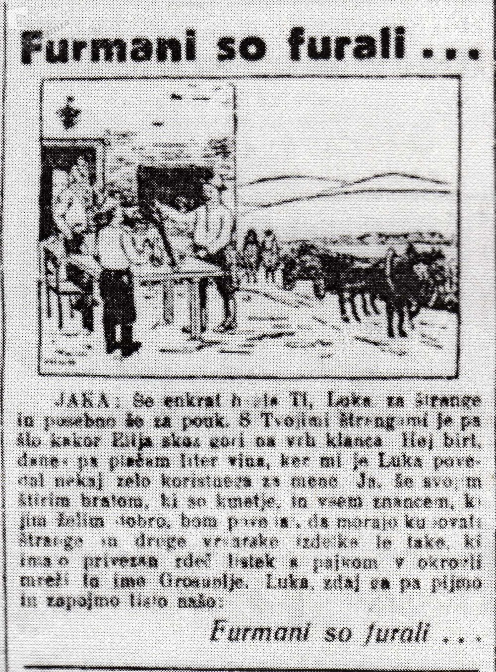 V Domoljubu, 42, 1929, št. 11, na str. 136, je bil objavljen oglas z naslovom Furmani so furali … :