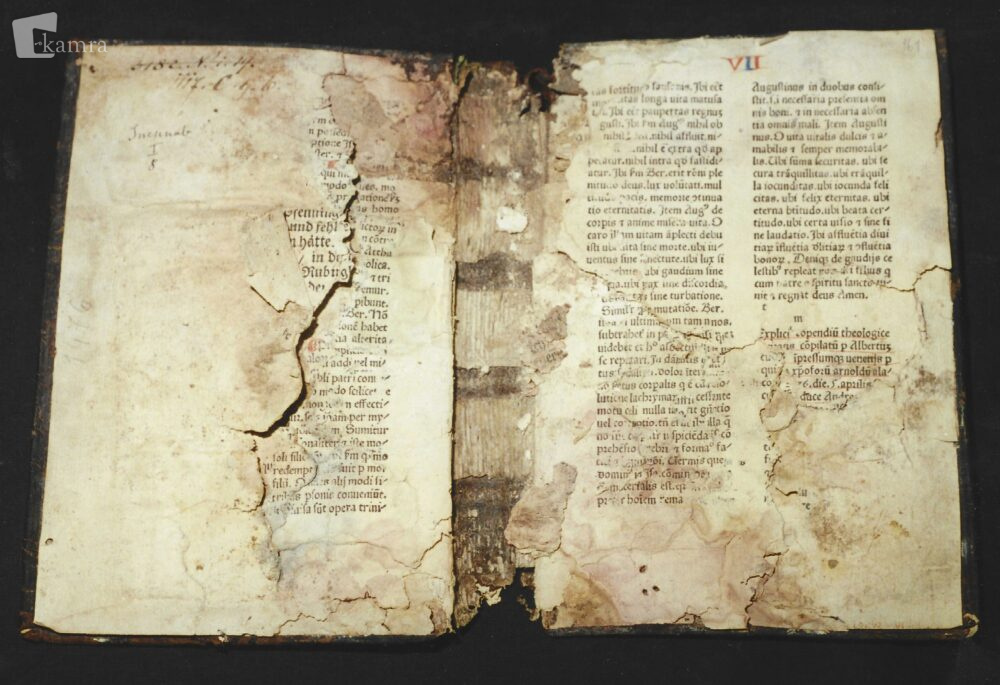 Inkunabula Compendium Theologiae Veritatis, najstarejši prvotisk v Škrabčevi knjižnici na Kostanjevici, v procesu restavriranja. Knjigo je napisal Albertus Magnus (Albert Veliki), eden najvplivnejših nemških filozofov in teologov srednjega veka.