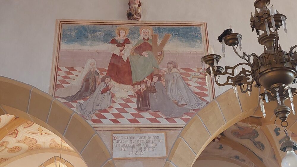 Donatorska freska: kamnoseški mojster Štefan z družino nad arkado v glavni ladji