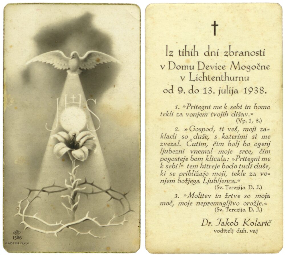 Duhovne vaje v Domu Device Mogočne v Ljubljani, 1938 Multimédiás elem 16.10.2025 22:06 közzétette Knjižnica Jožeta Udoviča Cerknica Duhovne vaje v Domu Device Mogočne v Ljubljani, Lichtenthurnov zavod (Marijanišče), 9.–13. julij 1938. Sveti Duh. Milano: NB Nino Basevi, od leta 1927. Mere: 5,7 x 10,3 cm. Zbirka Joži Mele iz Cerknice. Slika FacebookXPinterestLinkedIn Natisni Natisni brez slik