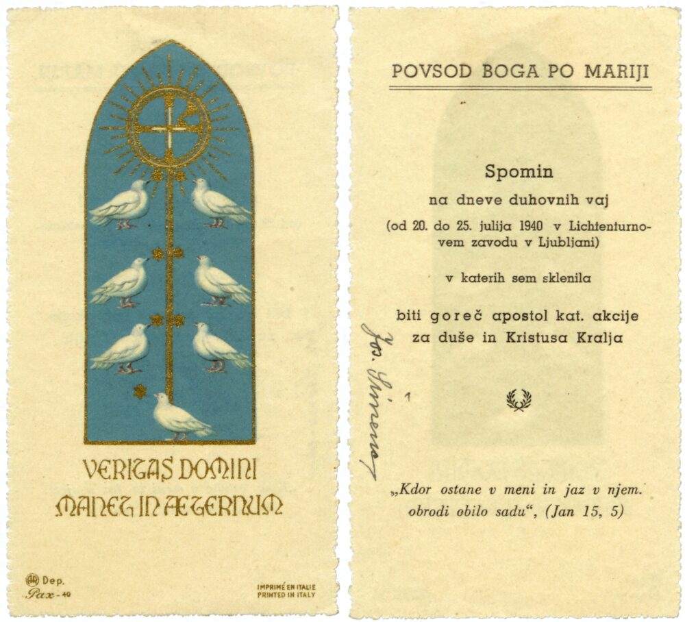Duhovne vaje v Domu Device Mogočne v Ljubljani, 1940 Multimédiás elem 16.10.2025 22:06 közzétette Knjižnica Jožeta Udoviča Cerknica Duhovne vaje v Domu Device Mogočne v Ljubljani, Lichtenthurnov zavod (Marijanišče), 20.–25. julij 1940. Sveti Duh. Milano: AR Ambrosiana Riproduzioni, 1910–1970. Mere: 6,3 x 11,5 cm. Zbirka Joži Mele iz Cerknice. Slika FacebookXPinterestLinkedIn Natisni Natisni brez slik