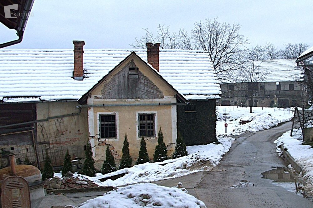 Zadnja stran hiše družine Gornik iz Slamne vasi 18, v kateri je med narodnoosvobodilnim bojem delovala partizanska šola. Fotografijo je leta 2005 posnel in jo hrani Janez Pezdirec iz Slamne vasi.