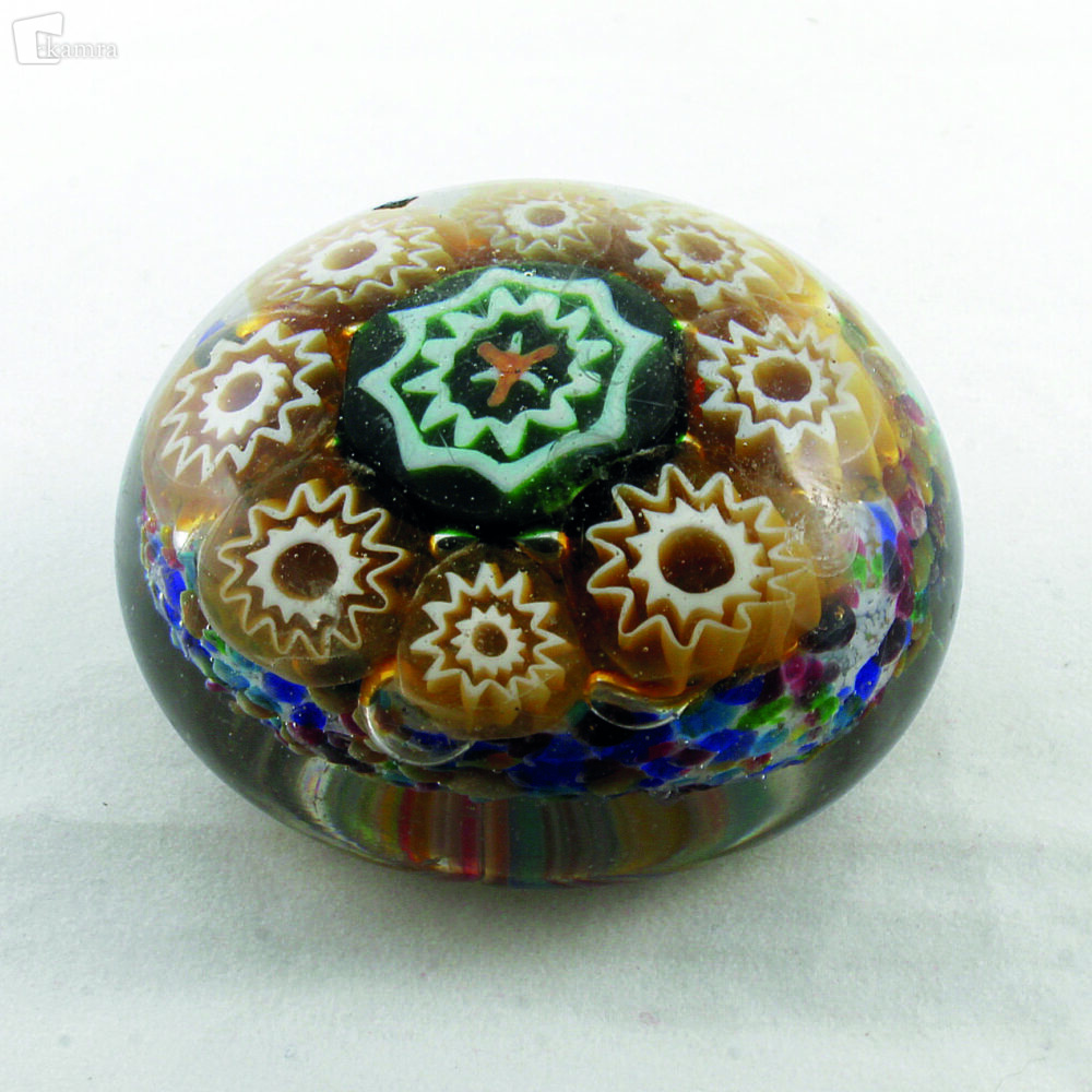 Češka (pred letom 1870 – 1900). Horizontalno-ovalen obtežilnik tipa »millefiori«. Velik osrednji cvet bele, zelene in oranžne barve obkroža osem cvetov iz rumenega in belega stekla. Celo cvetno polje leži na blazini iz raznobarvnih steklenih delcev. Baza obtežilnika je v srednjem delu konkavno obrušena. V = 44 mm, Š = 61 mm.