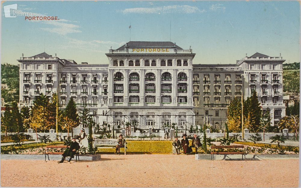 Hotel Palace leta 1912 Multimédiás elem 23.12.2022 10:36 közzétette Mestna knjižnica Piran Prikazuje Hotel Palace in park pred hotelom. Na hotelu je napis Portorose. V ospredju so štiri lesene klopi, dve beli in pred njima dve rjavi, na treh sedijo moški in ženske. Slika FacebookXPinterestLinkedIn Natisni Natisni brez slik