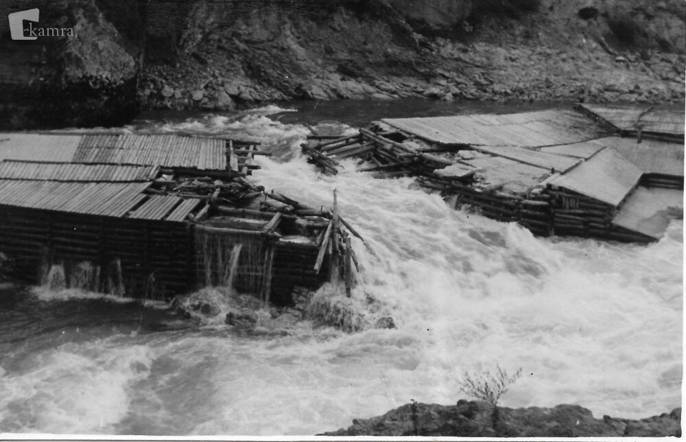 Razglednica prikazuje jez na Savi v Medvodah, ki ga je narasla voda v sredini razdrla. Na tem mestu je danes jez HE Medvode. Razglednica ni bila odposlana.
