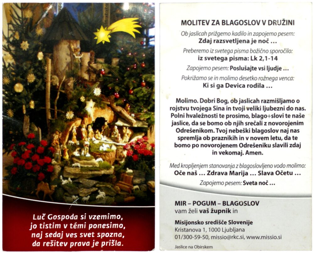 Jezusovo rojstvo Multimédiás elem 16.10.2025 22:05 közzétette Knjižnica Jožeta Udoviča Cerknica Jezusovo rojstvo, jaslice na Obirskem. Molitev za blagoslov v družini. Ljubljana: Misijonsko središče Slovenije. Mere: 8 x 13 cm. Zbirka Joži Mele iz Cerknice. Slika FacebookXPinterestLinkedIn Natisni Natisni brez slik