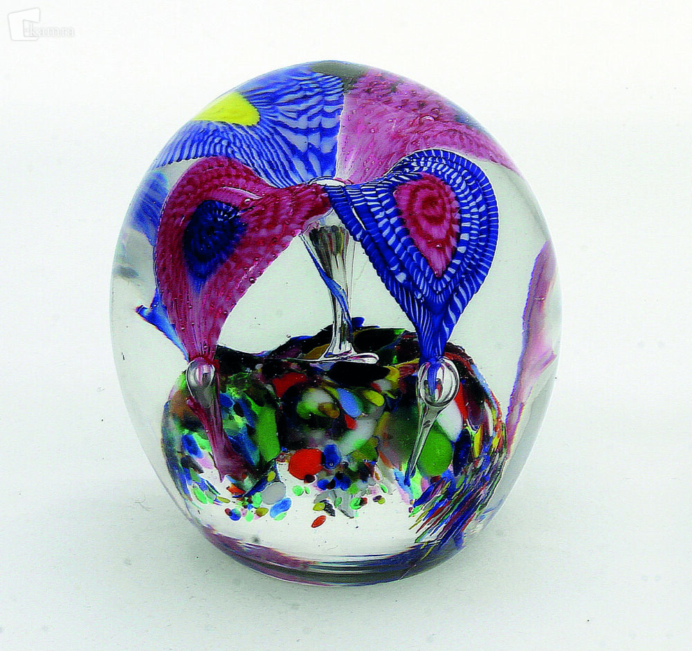 Pohorje? (pred letom 1909?). Kroglast obtežilnik, ki je v spodnjem delu nekoliko jajčasto podaljšan. Glavni motiv je velik osrednji cvet izdelan iz velikih ploščic rdečih, modrih in rumenih pletenic. V osrednjem delu je mehurček, ki se nadaljuje v pisano podlago v obliki cvetličnega lončka. Zaključki cvetnih listov so na zunanji strani upognjeni do mehurčkov, ki se zadirajo v zunanjo steno lončka. Baza je ravna in polirana. V = 85 mm,Š = 79 mm.