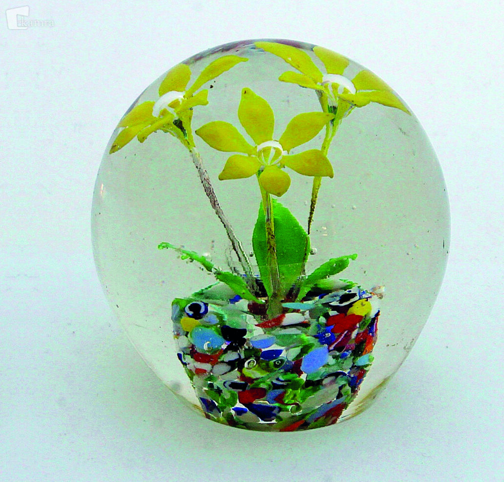 Hrastnik (1940). Kroglast obtežilnik s tremi rumenimi šestlistnimi cvetovi. Ekspandirani mehurčki na mestu pestičev so navzdol podaljšani v tanke cvetne peclje. Podlaga cvetnega motiva je v obliki pisanega cvetličnega lončka, iz katere ob cvetnih pecljih izraščajo trije zeleni listi. Baza je ravna in brušena. V = 82 mm, Š = 82 mm.