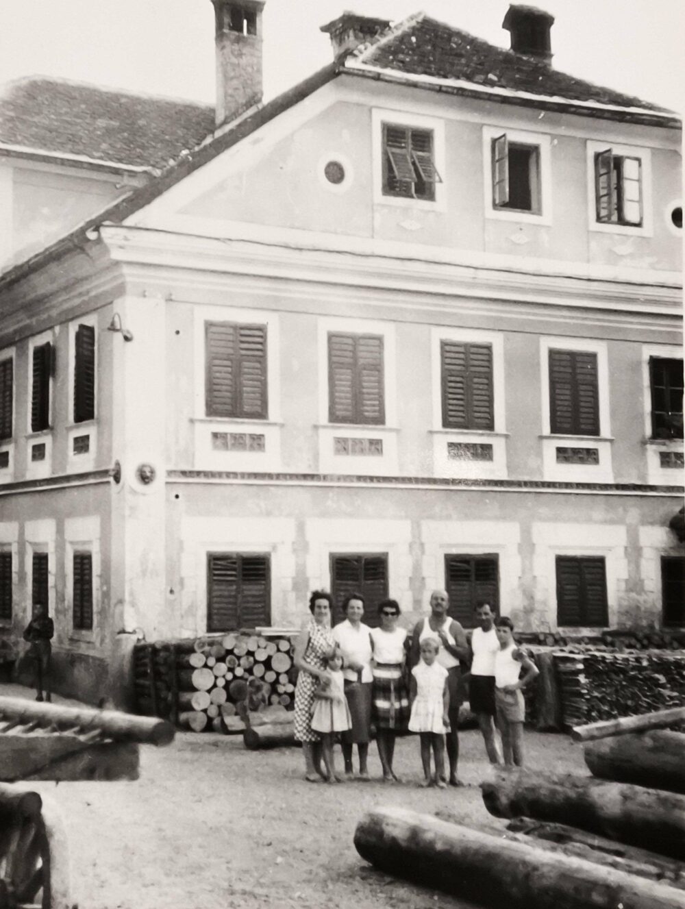 Rojstni dom pokojne Mojce je obiskala njena družina iz Nemčije. Z leve: Nuša Kranjc – druga Tonetova žena, Olga Oman, por. Pečnik (Fanina sestra), Marjanca (prva Mojčina hči), Janez Marolt, Tone Kranjc. Otroci, z leve: Lučka (druga Mojčina hči), Silva (Janezova prvorojenka), Roman (Mojčin sin).