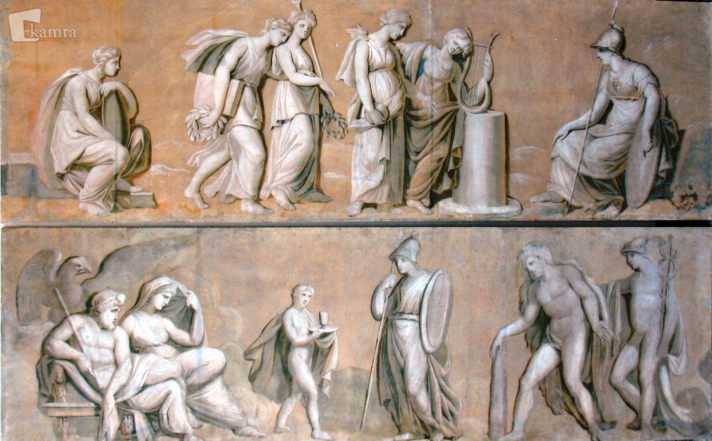 Sredi prve tapete (zgoraj) so upodobljene štiri muze, zaščitnice znanosti in umetnosti. Iz leve proti desni stojijo: Kaliopa (muza epske poezije), Klio (muza zgodovine) in Uranio (muza astronomije), četrta je najverjetneje Erato (muza ljubezenske poezije). Levo in desno od muz sta sedeči ženski figuri s ščitoma. Leve ni mogoče z gotovostjo identificirati, desna je Atena.