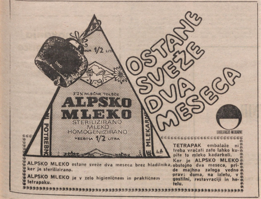 Oglas podjetja Ljubljanske mlekarne, ki deluje že od leta 1956. Sedež je na Tolstojevi ulici 63 v Stožicah.