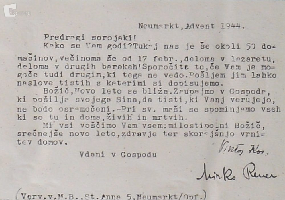 “Korespondenca. Ker so nekateri ostali v lagerju, je bila tu nekaka centrala, kjer se mi je nabralo 400-500 naslovov naših ljudi, ki so bili razstreseni po celi Bavarski. Mnogo je bilo dopisovanja. Ljudje so poročali, kako se jim godi, in vpraševali po novicah iz domovine in lagerja. K nam so namreč vedno novi prihajali ni so nam kaj povedali, kar je vse zanimalo. Zelo važno je tudi bilo posredovati naslovov med našimi ljudmi samimi, ki bi drugače ne vedeli eden za drugega.” (Kronika, Iz požganih, 1994, str. 45)
