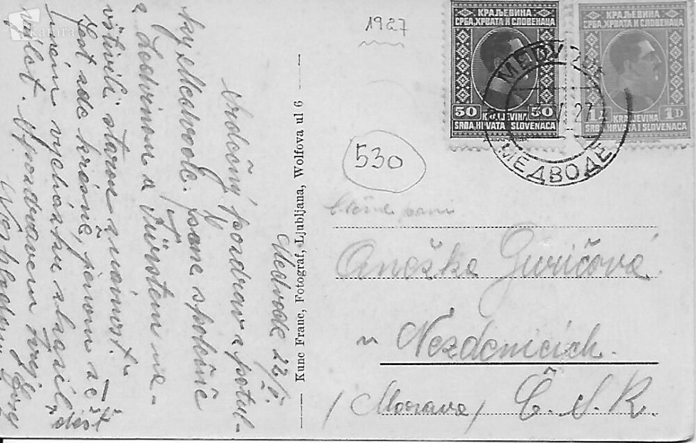 Pogled iz Medvod na Presko s tovarno Color Multimédiás elem 10.12.2025 09:34 közzétette Knjižnica Medvode Na razglednici je pogled iz Medvod na Presko s tovarno Color v ospredju, ki je danes v lasti japonskega koncerna Kansai. Razglednica je bila 22. 5. 1927 poslana na Moravsko, Češkoslovaška. Slika Hrbtna stran FacebookXPinterestLinkedIn Natisni Natisni brez slik