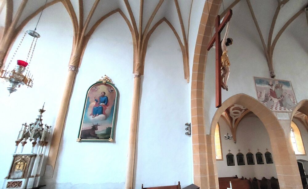 Gotska obočna rebra se v prezbiteriju združijo in težo oboka prenesejo na služnike stene. Ti segajo vse do tal. Ladijska obočna rebra se zaključijo s figuralnimi konzolami v zgornji polovici stene. Na steni vidimo sliko sv. Luka, ki je avtor tretjega od štirih evangelijev in pisec Apostolskih del Nove zaveze. Pogosto je upodobljen s knjigo v roki, volom ob nogi, saj v svojem evangeliju poudari Kristusa kot velikega duhovnika, ki mu kot daritvena žival pripada vol.