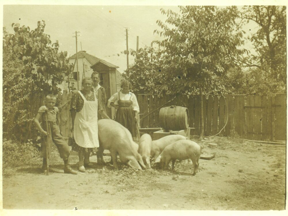 Zadnja skupna slika Poldikine družine na dvorišču Pečarjeve domačije v Kamnici 23, poleti 1937. Levo stoji brat Hansi z berglami, zraven njega mama Leopoldina Pečar. Zadaj očim Bogomir Pečar in desno Leopoldinina najstarejša sestra Maria Schunko (roj. Köberl), znana kot “teta Mitzi”. V ospredju štirje prašiči angleške bele pasme.