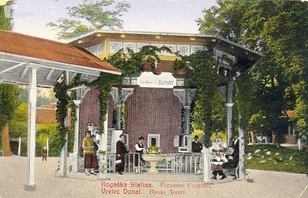 Razglednica prikazuje paviljon Donat, ki so ga leta 1909 postavili nad istoimenskim vrelcem zdravilne vode v parku Rogaške Slatine. Med 1909 in 1953 je paviljon služil kot točilnica mineralne vode iz tedanjih Podzemnih vrelcev. Paviljon Donat je bil s pokritim hodnikom povezan z Zagrebškim domom. Odstranjen je bil leta 1954.