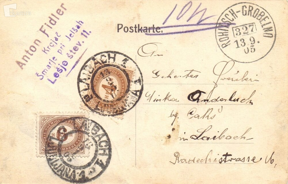Na hrbtni strani razglednice se nahaja železniški poštni žig Rogatec-Grobelno.