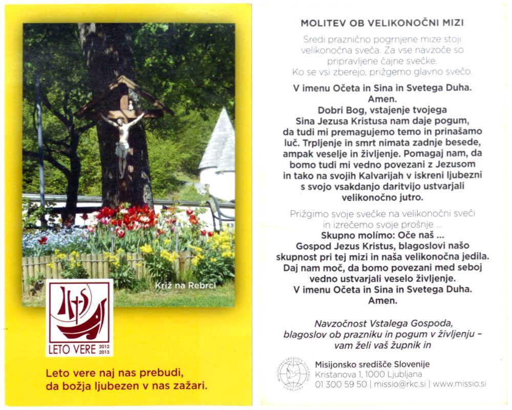 Razpelo Multimédiás elem 16.10.2025 22:05 közzétette Knjižnica Jožeta Udoviča Cerknica Razpelo (Križ na Rebrci). Molitev ob velikonočni mizi in velikonočno voščilo, leto vere 2012–2013. Ljubljana: Misijonsko središče Slovenije. Mere: 8 x 13 cm. Zbirka družine Kranjec iz Topola pri Begunjah. Slika FacebookXPinterestLinkedIn Natisni Natisni brez slik