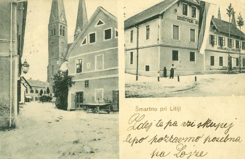 Razglednica je bila napisana in odposlana. Razdeljena je na dva dela. Na levi strani je pogled po ulici proti osrednjem trgu pred cerkvijo sv. Martina iz litijske smeri. Na desni strani je na fotografiji poslopje Društvenega doma in Hranilnice – posojilnice. Desno spodaj je besedilo Šmartno pri Litiji. Založnik: Leskovec&Gruden, Šmartno pri Litiji.
